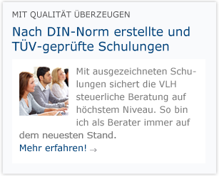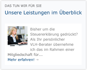 Der Lohnsteuerhilfeverein Vereinigte Lohnsteuerhilfe e.V. (VLH) stellt Ihnen Informationen mit großer Sorgfalt zur Verfügung. Dennoch können Fehler nicht ganz ausgeschlossen werden. Eine Haftung oder Garantie für die Richtigkeit und Vollständigkeit der zur Verfügung gestellten Informationen kann deshalb nicht übernommen werden.